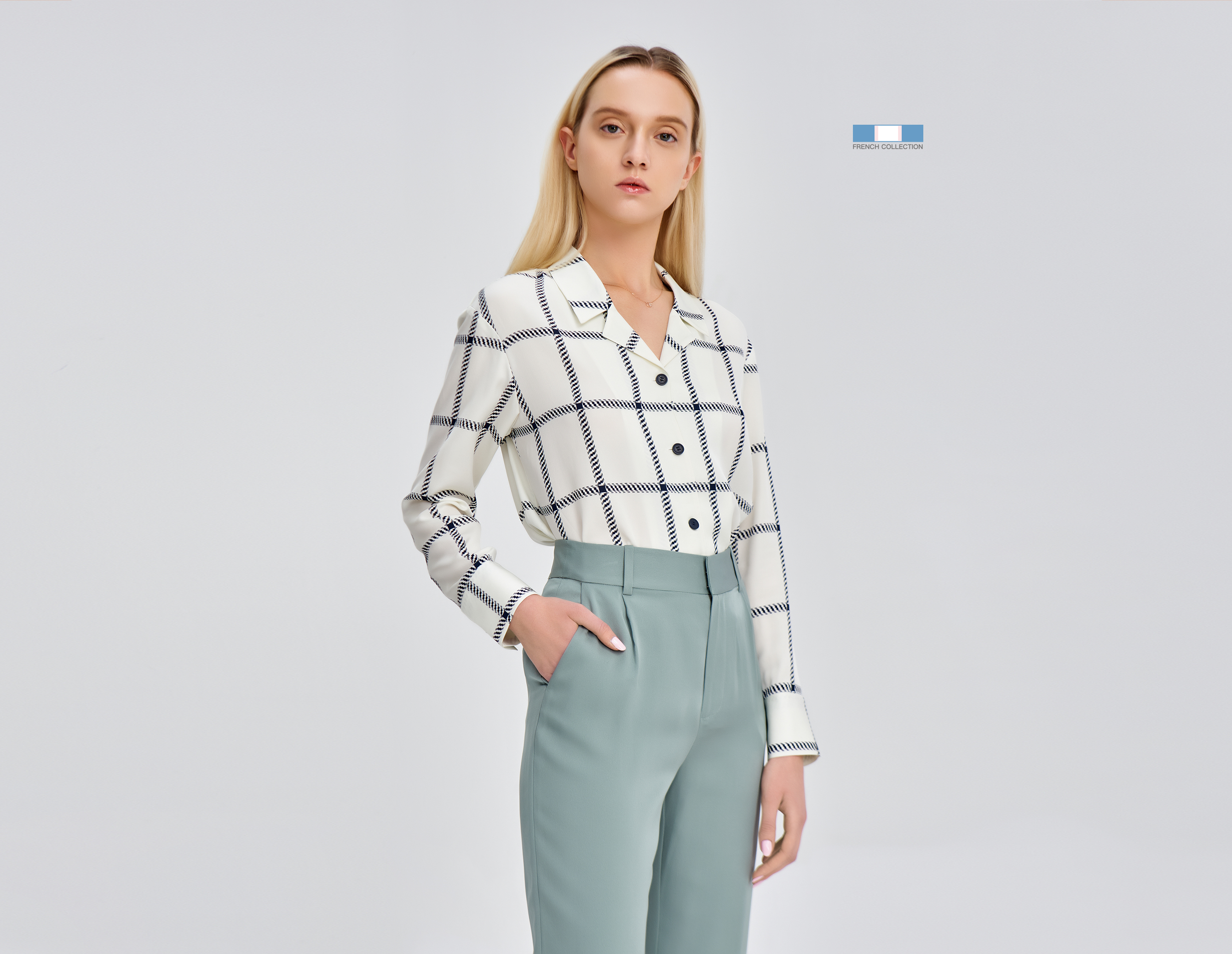 复古翻领设计给衬衫款带来更加女性化的装饰效果。